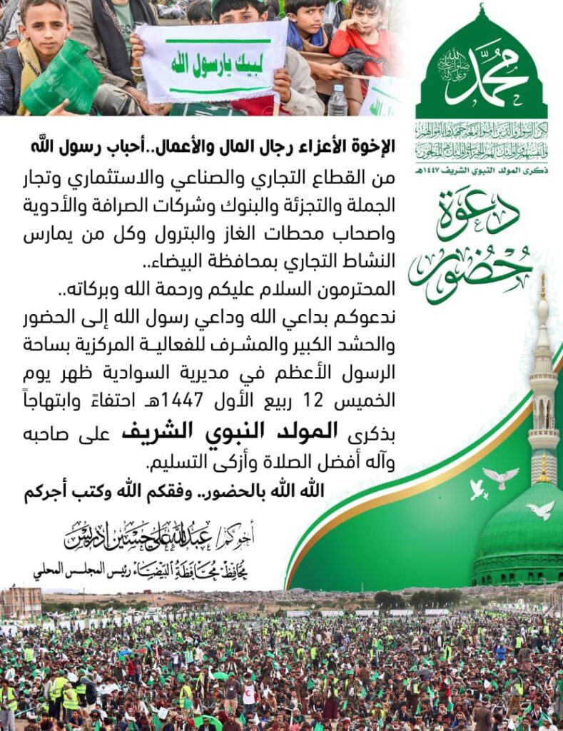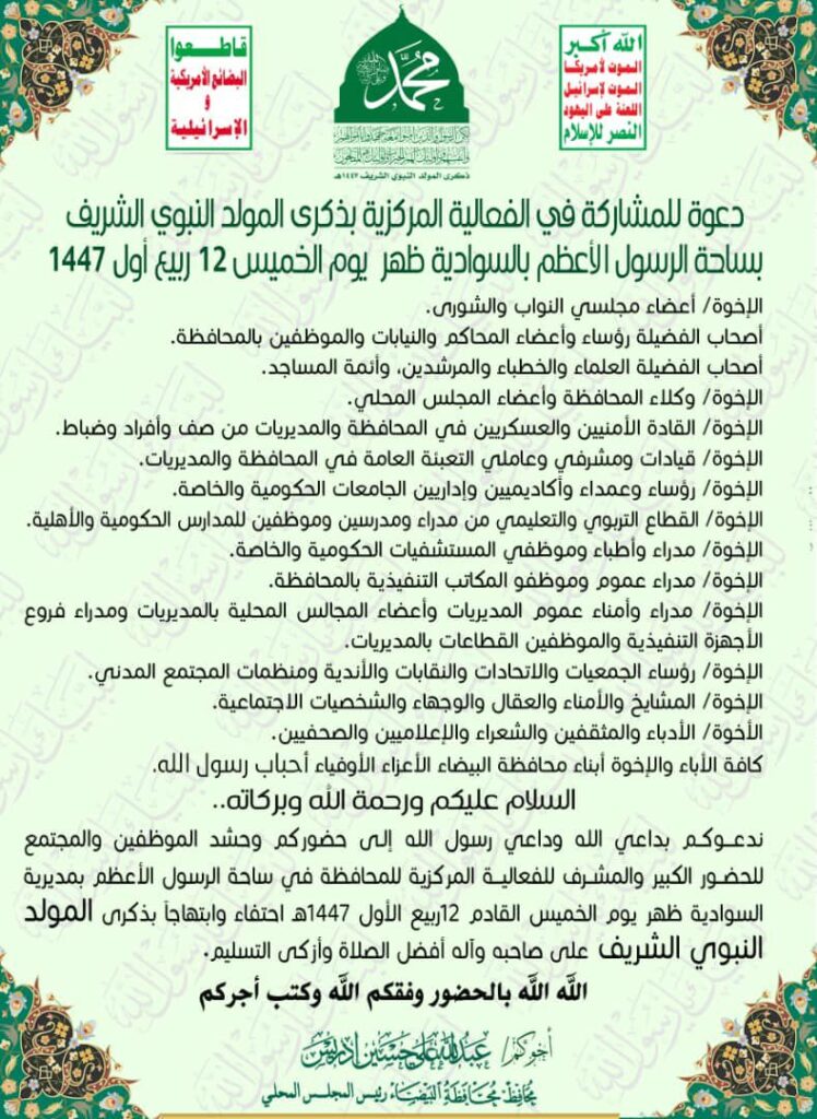 فعالية بمديرية الشرية في البيضاء بذكرى المولد النبوي الشريف الأحد، 08 ربيع الأول 1447هـ الموافق 31 أغسطس 2025
