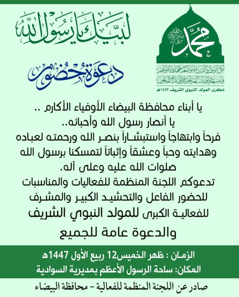 فعالية خطابية بمديرية مسورة في البيضاء بذكرى المولد النبوي الثلاثاء، 10 ربيع الأول 1447هـ الموافق 02 سبتمبر 2025